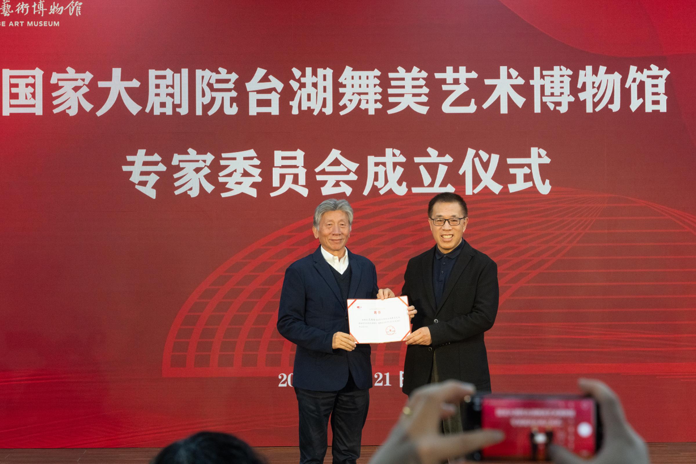 国家大剧院院长王宁为中国美术家协会主席、北京美术家协会主席范迪安颁授聘书。牛小北/摄